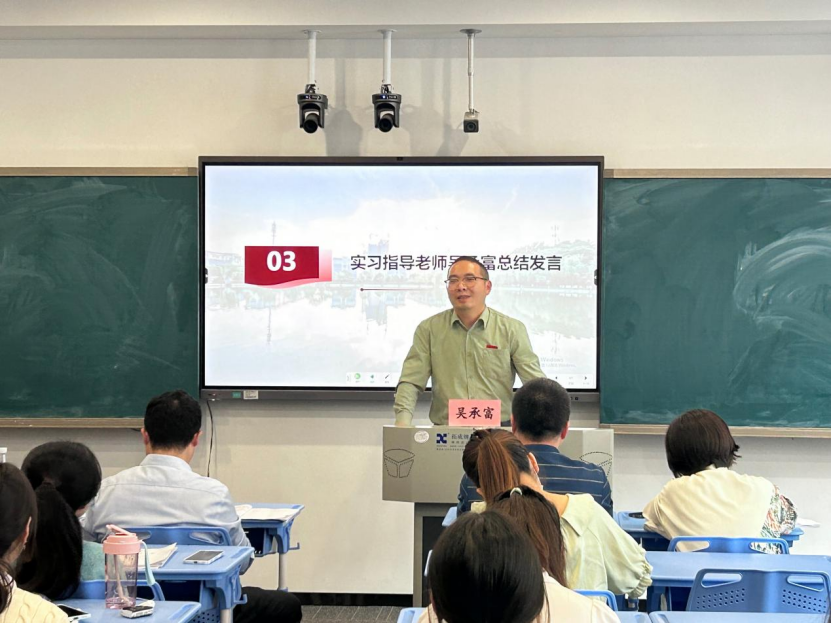 随后,公司实习指导教师吴承富对实习工作进行了总结。他回顾了实习期间的工作情况,指出这是一次特殊的实习,两个月来,实习队员面临着考研面试、毕业论文和教学实习三项任务叠加,顶着重大的压力,圆满完成了实习工作。吴老师总结了实习期间大家的成长和收获,也希望同学们在未来继续不断学习,努力提升自我。