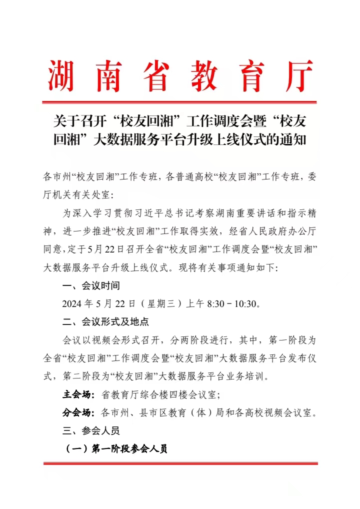 关于召开“员工回湘”工作调度会暨“员工回湘”大数据服务平台升级上线仪式的通知