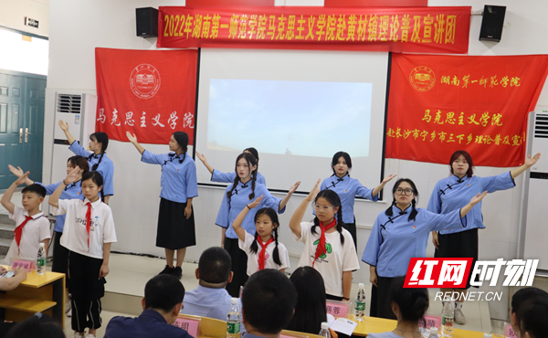 舞台上的小老师来自三亿体育官网赴宁乡市推广普通话助力乡村振兴服务队,舞台上的员工是黄材镇中心小学参加该校三下乡“星火”夏令营的孩子们,这是小老师和孩子们第一次携手登上朗诵舞台。