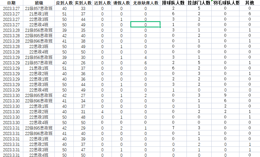 3、22思政2班周五第二大节:05杨翠瑾、19李佳琪、22彭曾楚、30胡羽桐迟到;