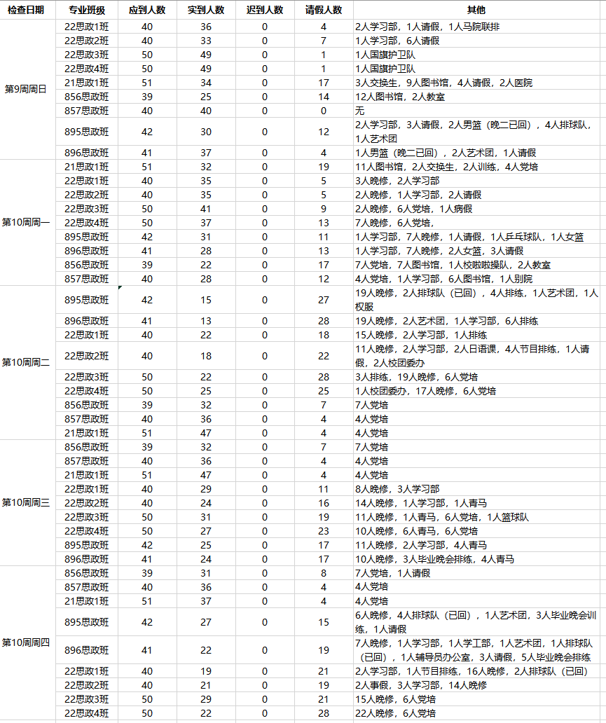 本周早自习情况总体良好,但仍有个别同学未按时参加早自习,名单如下:22思政3班44号葛翔宇。对这位同学予以扣除德育分两分处理,望其他同学引以为戒。