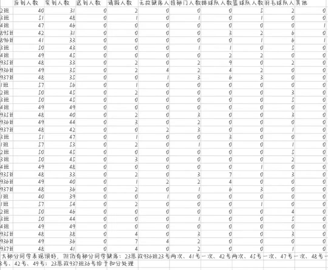 总结:本周早自习大部分同学表现很好,但仍有部分同学缺席:23思政936班23号张梦婷子两次、41号张汗泽一次、42号李中翰两次、45号傅灏文一次、47号杨恩旭一次、48号何泳先一次、49号赵晓韵两次;23思政937班36号刘思思两次、24号万源源一次;22思政1班11号曾慧一次。