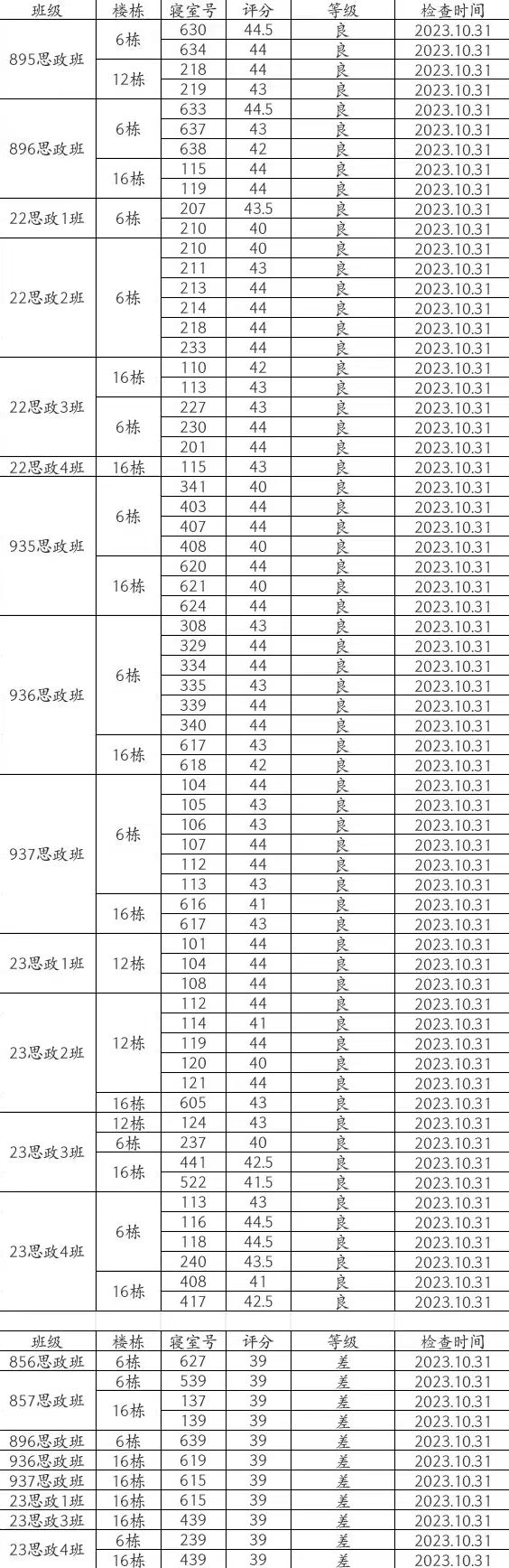 总结:本周卫生大检优寝比率较之前有所提高,总体表现中等。其中937思政班与23思政1班混寝16-615(杨程、李书畅、陈国颖、全启航)、23思政3班与23思政4班混寝16-439(唐慕逍、张耿荣、周顺翔、周家利)、856思政班6-627(刘书筠、邓利菲、李欣悦、郭斯颖)、857思政班6-539(吴牧宁、李菁、唐小蕾)、857思政班16-137(丁嘉豪、周靖浩、符灿宇、田畅轩)、857思政班16-139(胡佳骏)、896思政班6-639(雷丽萍、袁雅琴、杨雪琴、肖子怡)、936思政班16-619(李中翰、何泳先、陈龙云、陆琦)、23思政4班6-239(黄静仪、汪红玉、曾紫洋、唐琼玥)等宿舍仍需继续改进!希望大家共同努力,建设文明美丽公寓!