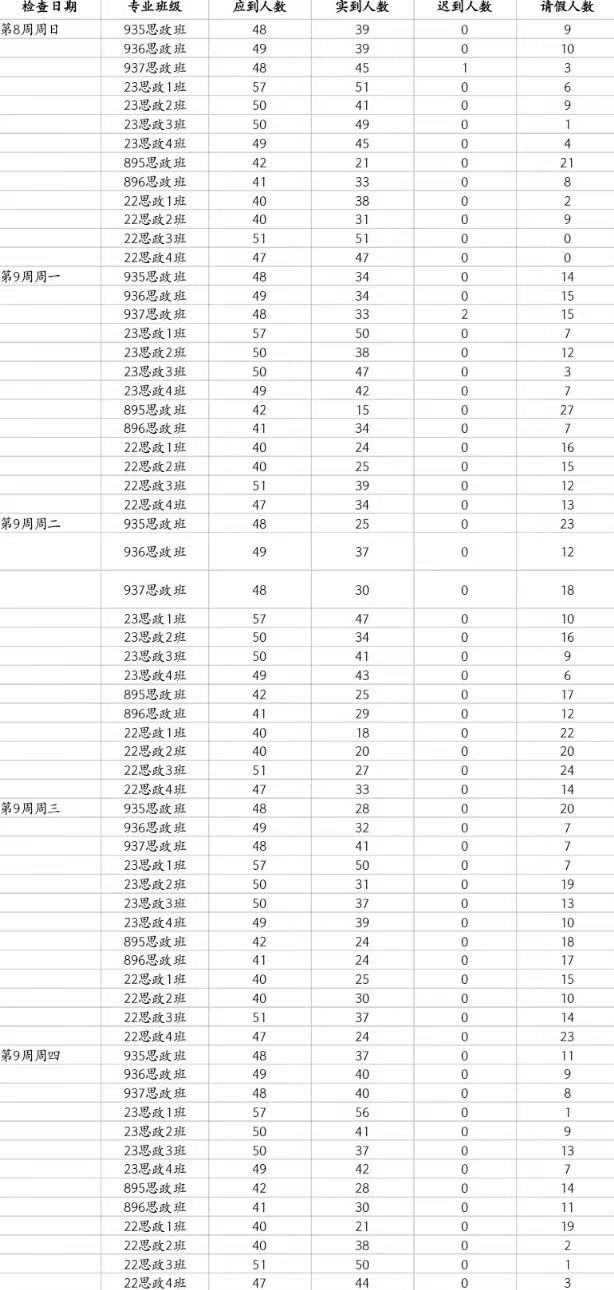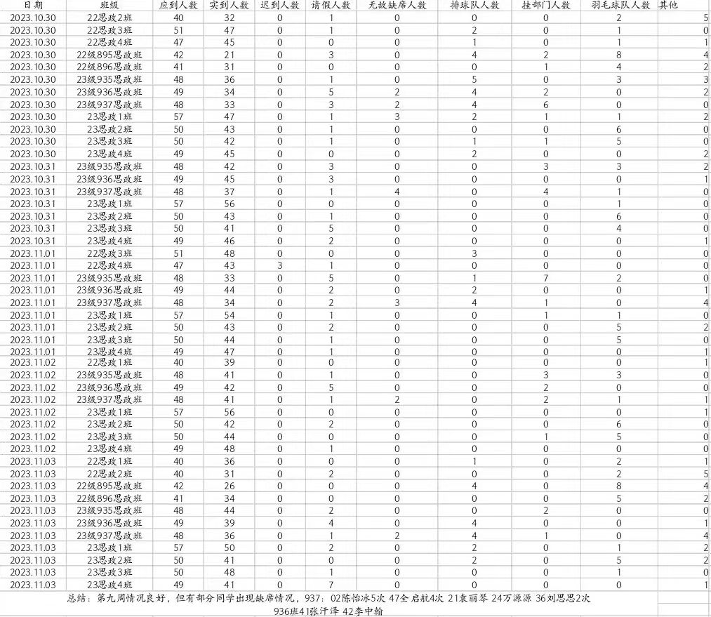 总结:第九周情况良好,但有部分同学出现缺席情况,且缺席人数与日剧增。937班:02陈怡冰5次,47全启航4次 ,21袁丽琴,24万源源,36刘思思2次。936班:41张汗泽,42李中翰。23思政1班:53田敬林,54李福红,55罗吉捷 。