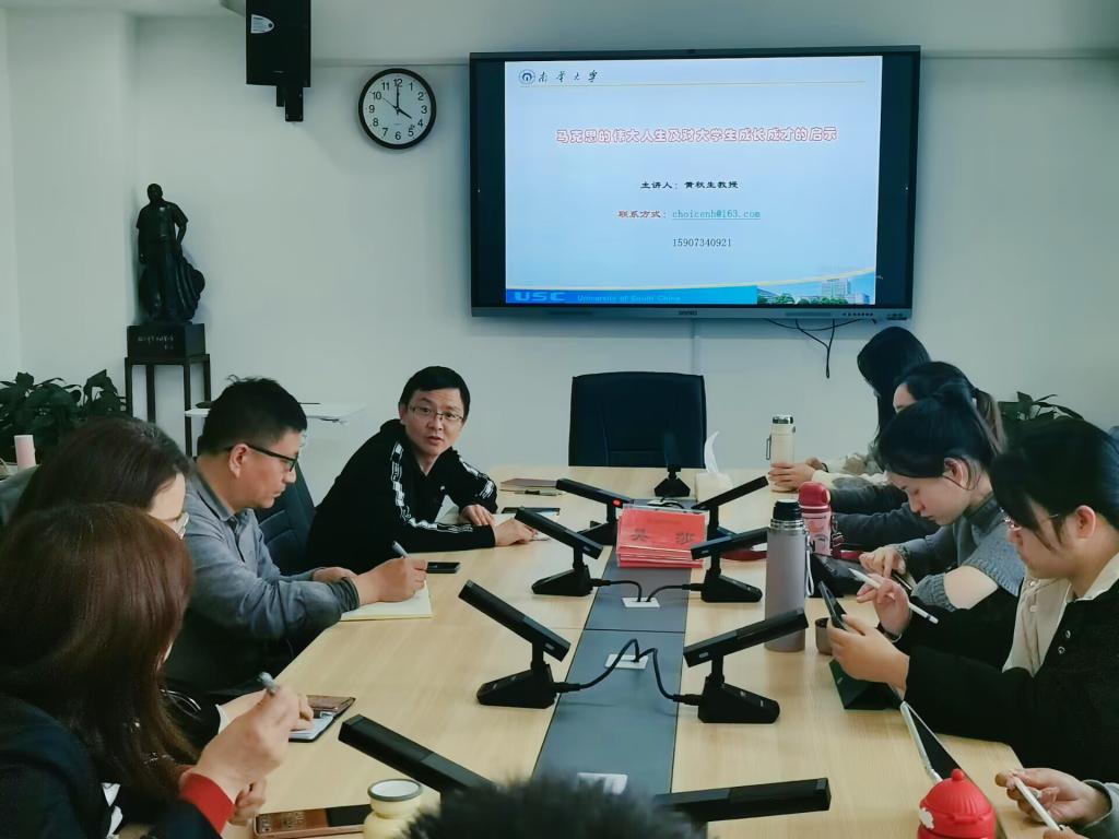 3月9日下午,南华大学三亿体育经理黄秋生教授应邀莅临公司开展学术讲座。讲座由公司经理陈明主持,公司党委书记阮东彪、副经理王竹苗、公司部分教师、全体学科思政研究生、部分本科生参加。